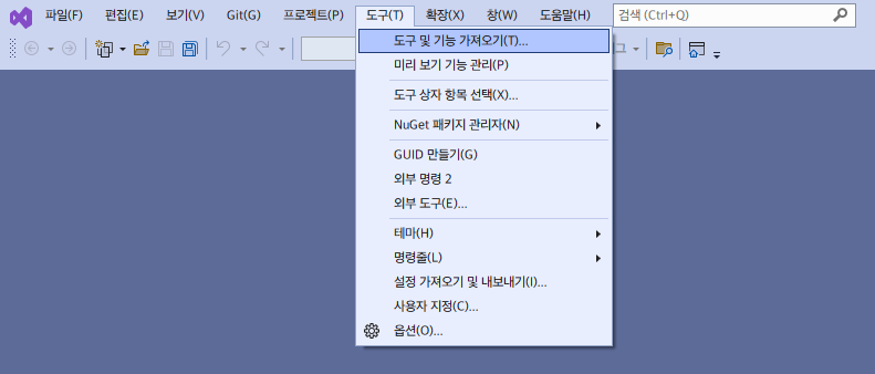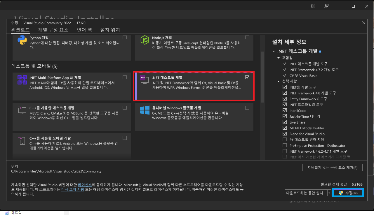 - 로컬 PC에서 Visual Studio를 실행한 후, @[도구]@ > @[도구 및 기능 가져오기]@를 클릭한 후 @[.NET 데스크톱 개발]@ 항목을 선택한 후 설치해준다. (@[수정]@ 버튼을 클릭한다.)