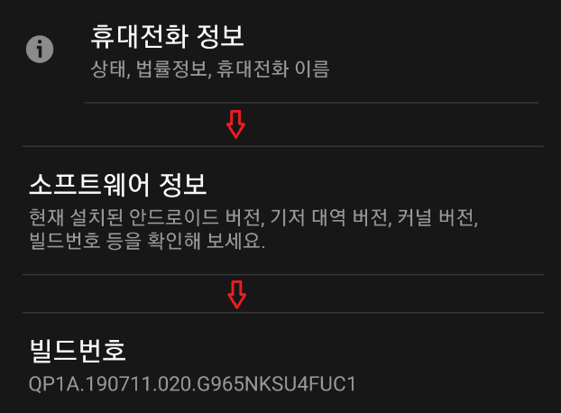 - @[개발자 도구]@는 [설정] > [휴대 전화 정보] > [소프트웨어 정보]에 진입한 후, @[빌드 번호]@를 여러번 연속으로 클릭해주면 나타나게 된다.
