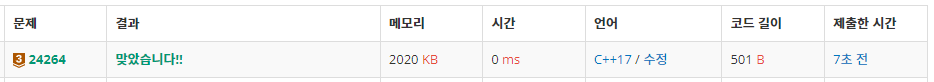 | [BOJ-24262][C++] 알고리즘 수업 - 알고리즘의 수행 시간 1 (0) | 2023.06.25 |