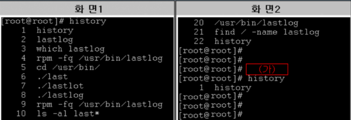 Linux 시스템에는 <화면1>과 같이 명령어 히스토리 기능을 기본으로 제공한다. 아래 <화면2>와 같이 기존에 사용한 명령어 히스토리를 모두 지우는 명령어와 옵션 (가)를 답안란에 입력하시오.