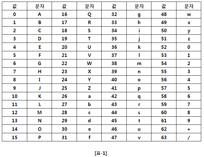 2. 버퍼의 위쪽부터 6비트씩 잘라 그 값을 읽고, 각각의 값을 아래 [표-1] 의 문자로 Encoding 한다.