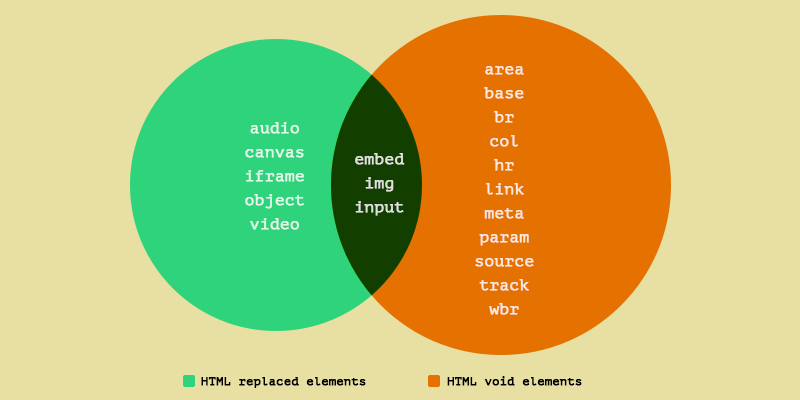 Learn more about the HTML replaced and void elements and visualize the intersection of these two HTML elements sets using a Venn diagram.