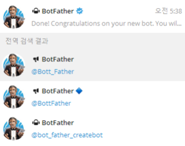| Done! Congratulations on your new bot. You will find it at t.me/봇이름_bot. You can now add a description, about section and profile picture for your bot, see /help for a list of commands. By the way, when you've finished creating your cool bot, ping our Bot Support if you want a better username for it. Just make sure the bot is fully operational before you do this. Use this token to access the HTTP API: ********************************************* Keep your token secure and store it safely, it can be used by anyone to control your bot. For a description of the Bot API, see this page: https://core.telegram.org/bots/api |