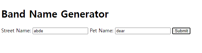 ![]() 로컬 서버(@localhost:3000@)에 접속하여 Street Name과 Pet Name을 적고 @[Submit]@ 버튼을 클릭한다. |