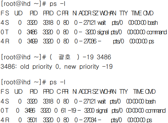 3. 다음은 프로세스 우선순위에 관한 명령어이다. ( 괄호 ) 안에 알맞은 명령어를 넣으시오.