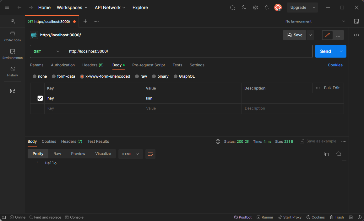 - Postman 프로그램에서 로컬 서버(@localhost:3000@)로 GET 요청을 보내본다.
