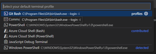 - @[Ctrl]@ + @[Shift]@ + @[P]@를 눌러서 명령 팔레트를 실행시킨 후 @default@를 검색하여 @Terminal: Select Default Profile@을 클릭한다.