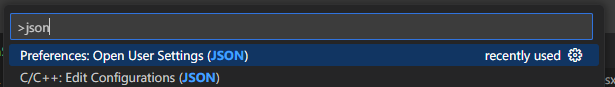 - @[Ctrl]@ + @[Shift]@ + @[P]@를 눌러서 명령 팔레트를 실행시킨 후 @json@를 검색하여 @Preferences: Open User Settings@를 클릭한다.