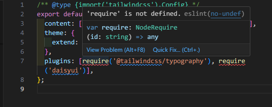- 테일윈드 설정 파일(@tailwind.config.js@)에서 @require@를 이용하여 플러그인(Plugin)을 추가할 때, @'require' is not defined@ 오류가 발생할 때 해결하는 방법을 정리해본다.