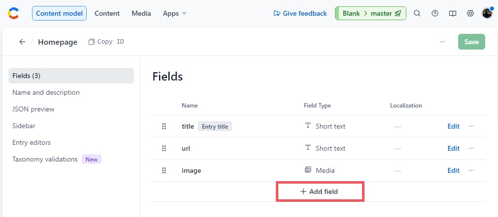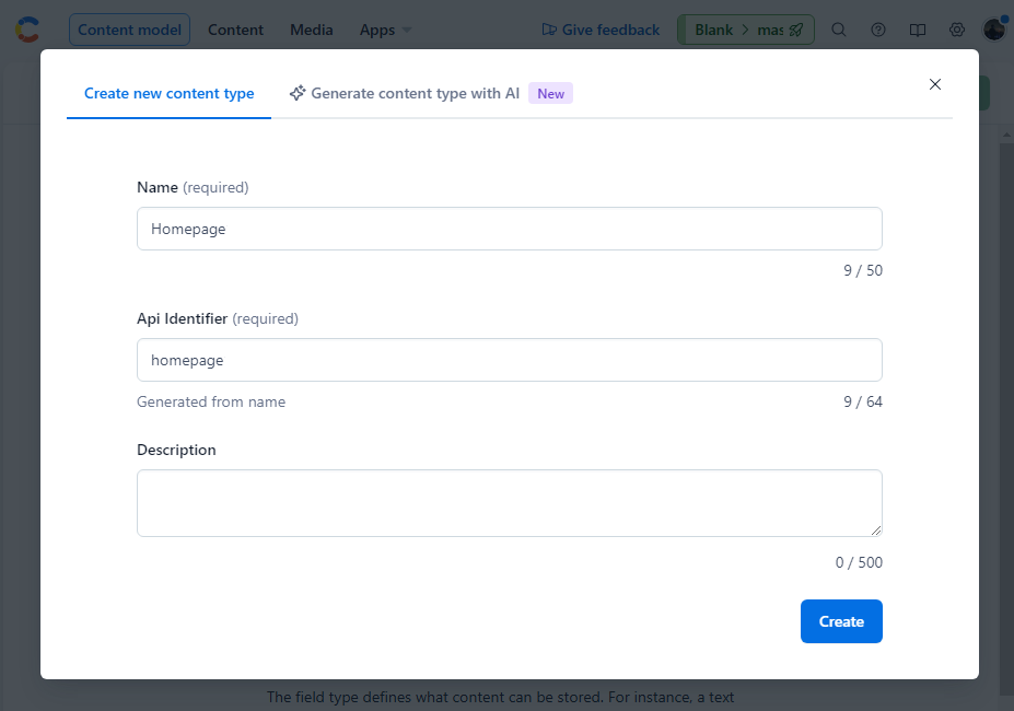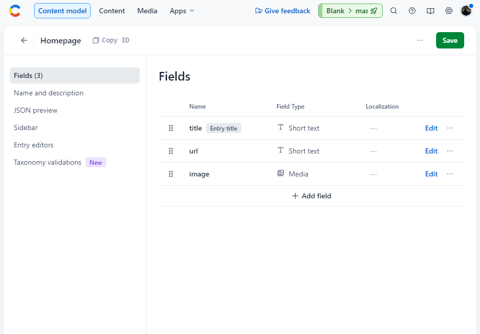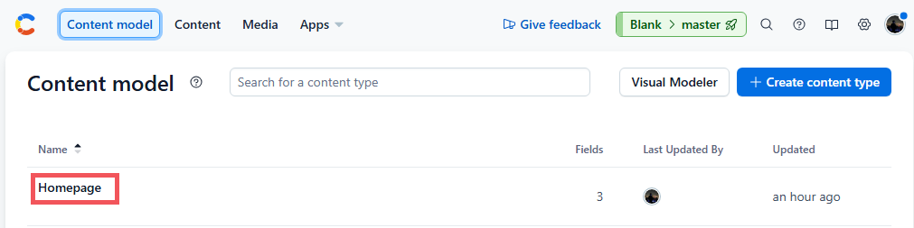 content_type: 'Homepage', // 컨텐츠 모델(Content Model) 이름
