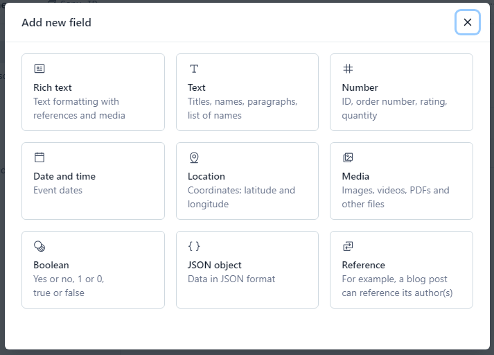 | Rich Text | - 서식이 있는 텍스트 - 미디어(이미지, 동영상 등) 포함 가능 - 다양한 기능 제공 (텍스트 스타일(Bold, Italic, Hyperlink), 목록, 표, 인라인 컨텐츠 참조(다른 컨텐츠와 연결) 등) |