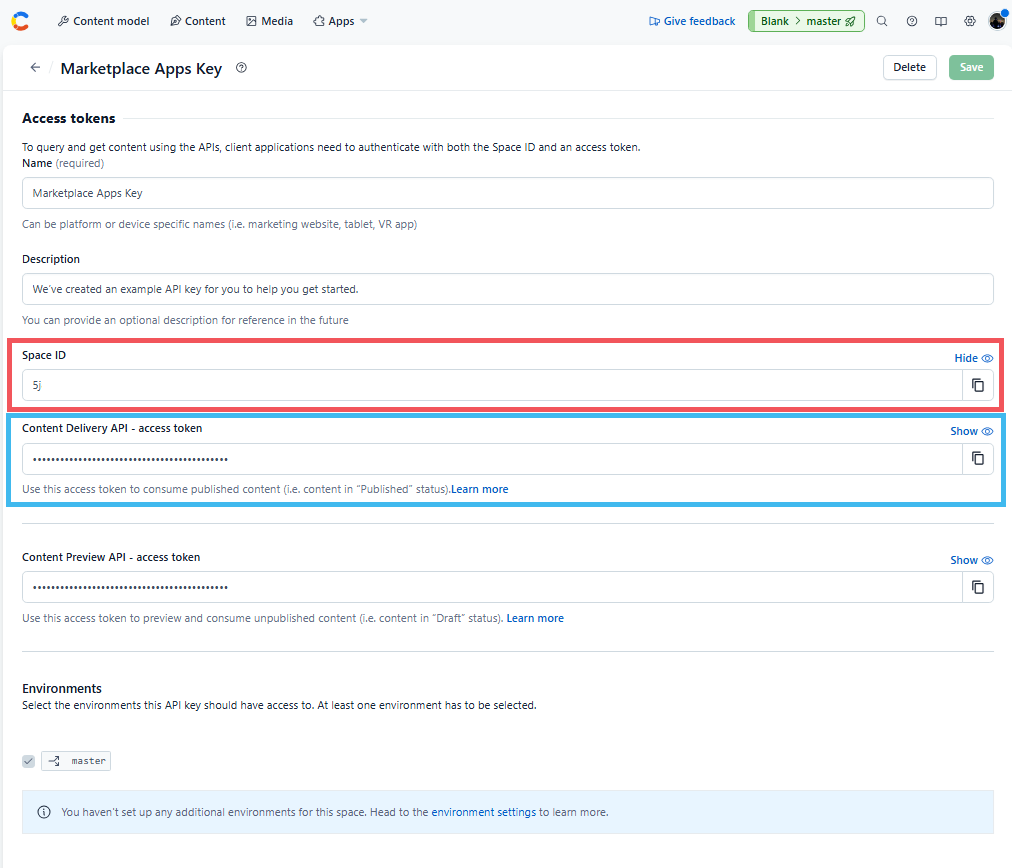 - @Marketplace Apps Key@ 항목을 클릭한 후, @Space ID@ 값과 @Content Delivery API - Access Token@ 값을 복사한다.