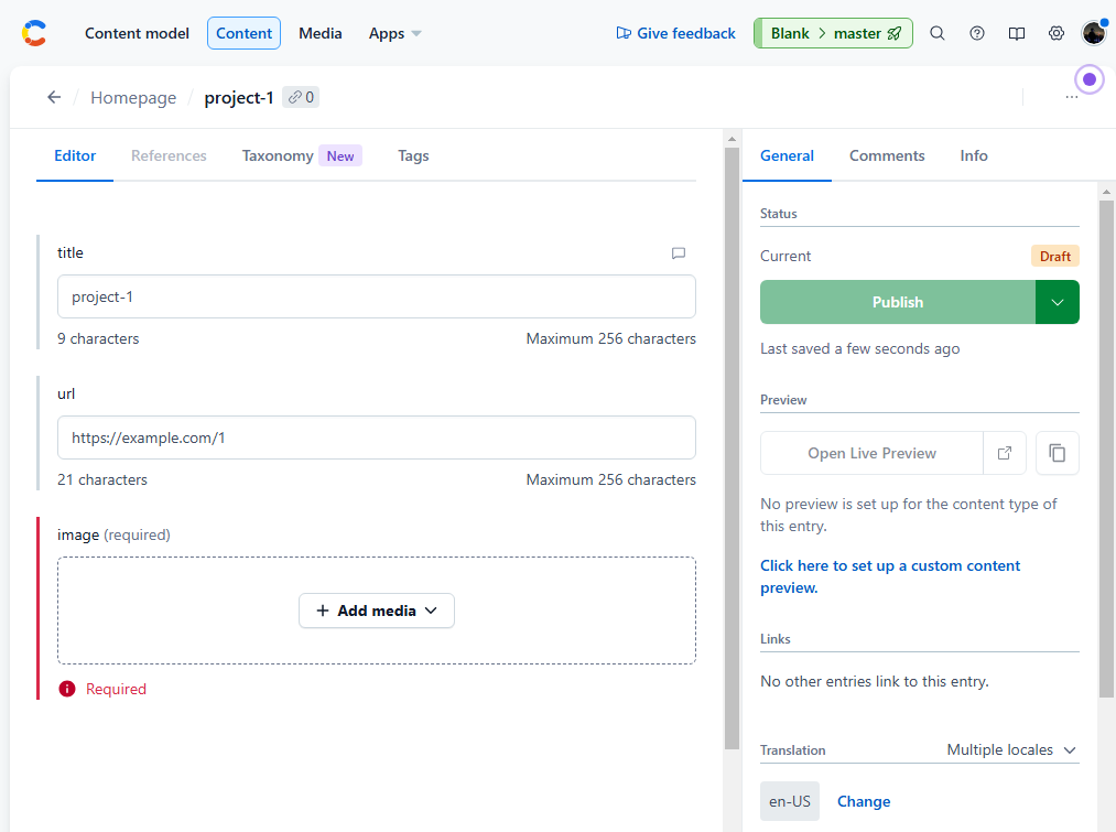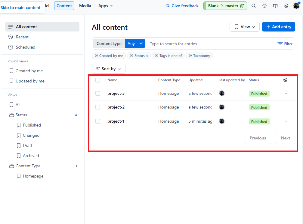 - Contentful에서 엔트리(Entry)는 컨텐츠 항목 하나를 의미한다.