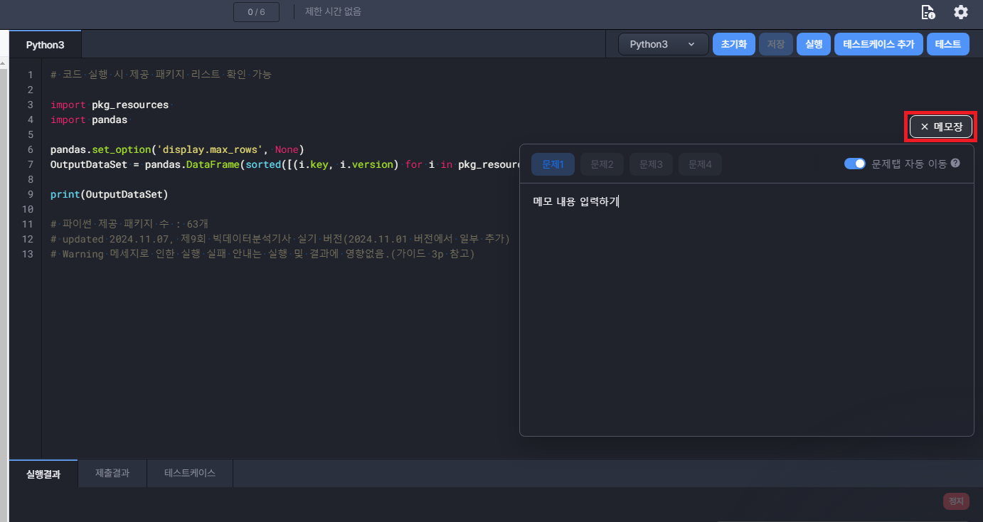 - 시험장의 구름 온라인 IDE에 설치된 패키지 목록과 버전을 확인하려면 아래의 코드를 실행하면 된다.