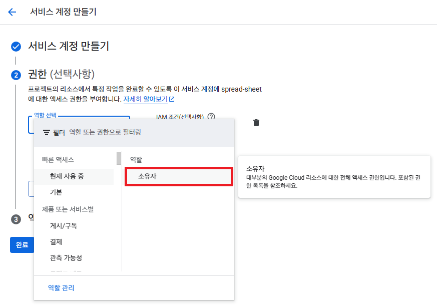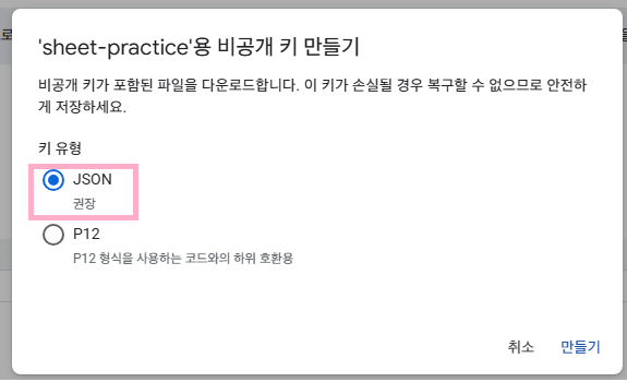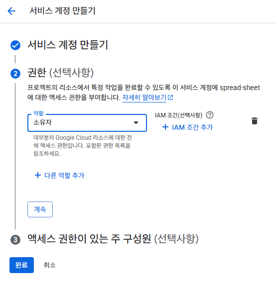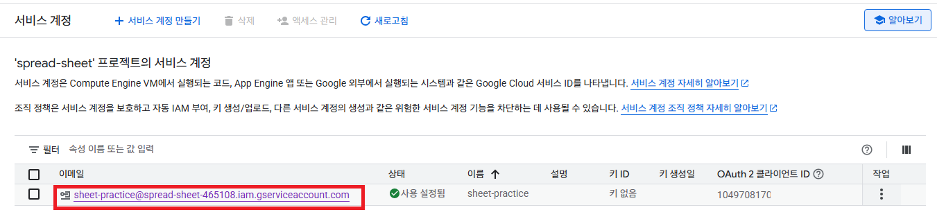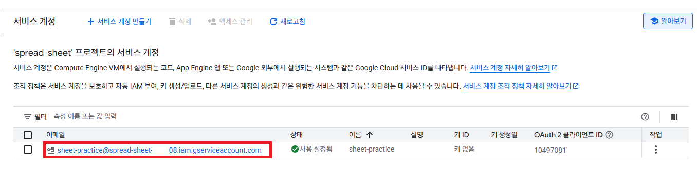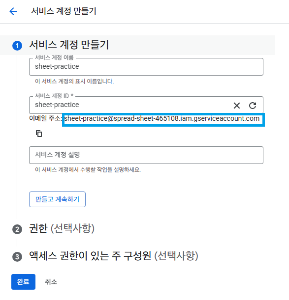 - @서비스 계정 ID@의 경우, 향후 구글 시트 문서에서 공유할 대상인 이메일의 ID로 사용된다.