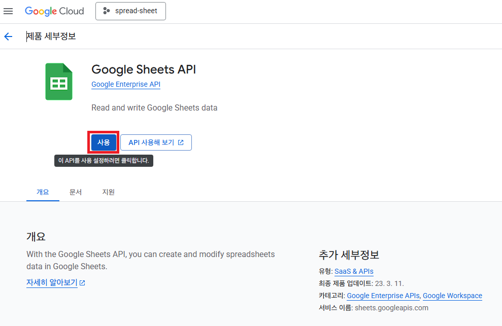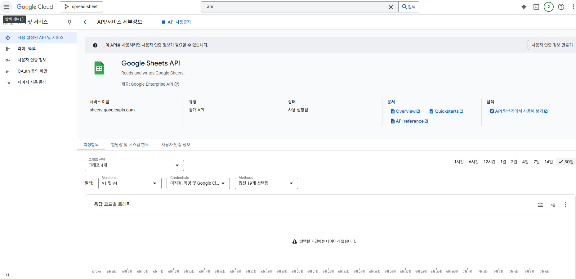 - 이제 Google Sheets API를 사용할 수 있게 되었다.