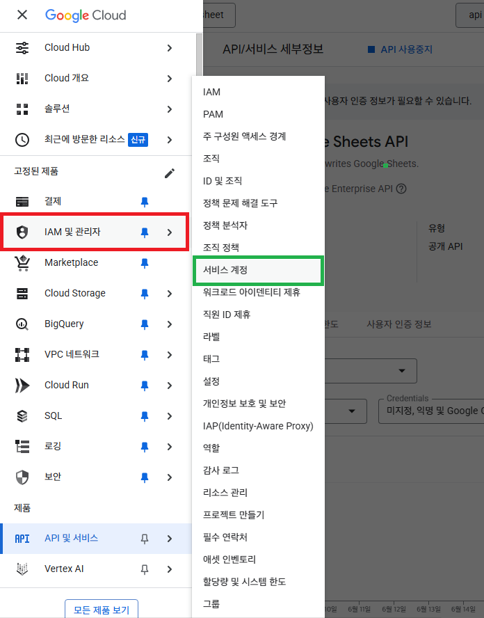 - 사이드바가 표시되면, @[IAM 및 관리자]@ > @[서비스 계정]@을 클릭해준다.