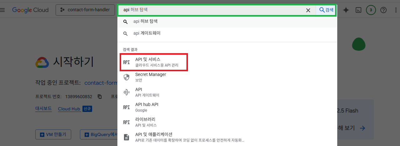 - 생성한 프로젝트에 들어온 후, 상단의 검색창에 @API@를 검색한 후, @[API 및 서비스]@를 클릭한다.