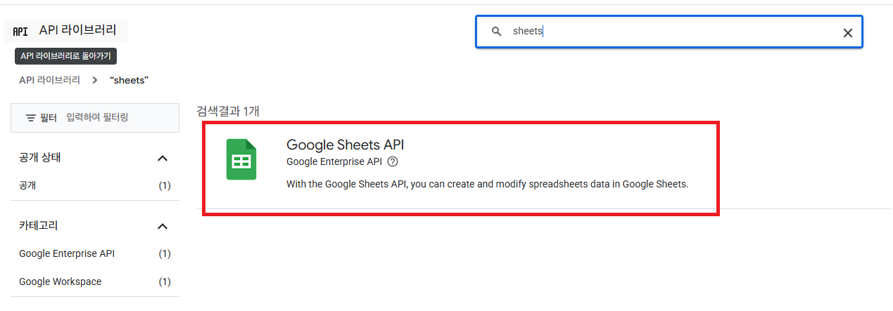 - 검색창에 @sheets@ 를 검색한다. 그리고 표시되는 @Google Sheets API@ 항목을 클릭한다.