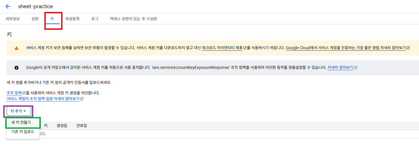 - 상단의 @[키]@ 탭을 클릭한 후, 새로운 키를 생성해준다.