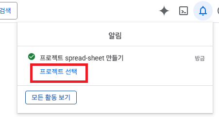 - 알림창에서 프로젝트 생성 여부를 확인할 수 있다. @[프로젝트 선택]@을 클릭하여 생성된 프로젝트로 이동한다.