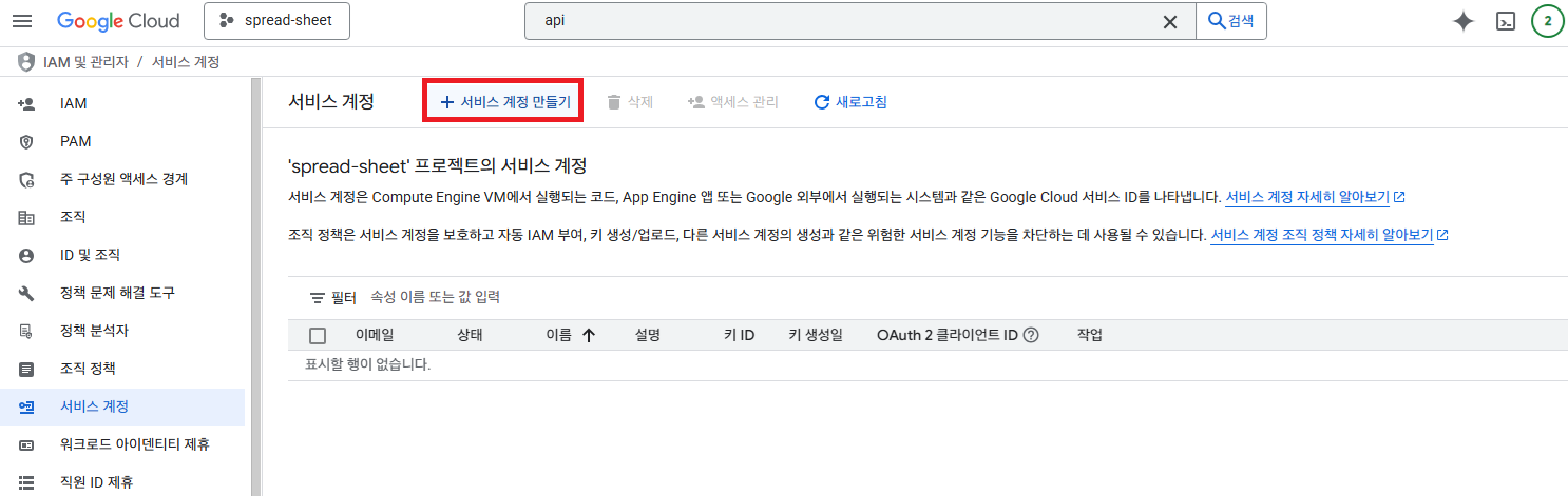 - @[+ 서비스 계정 만들기]@ 버튼을 클릭해서 서비스 계정을 만들어준다.