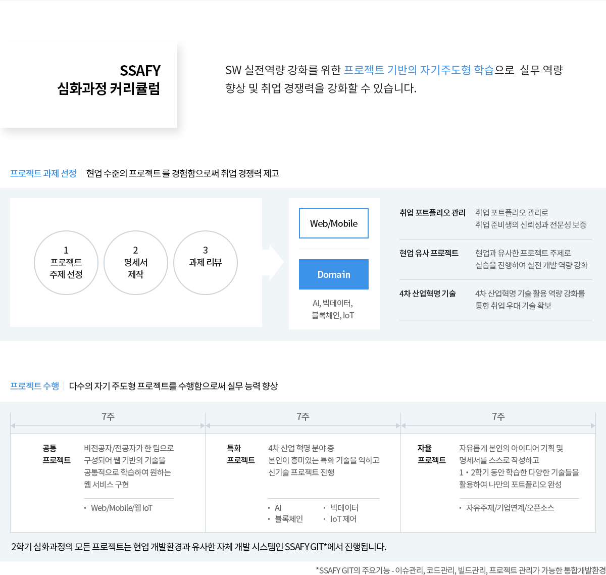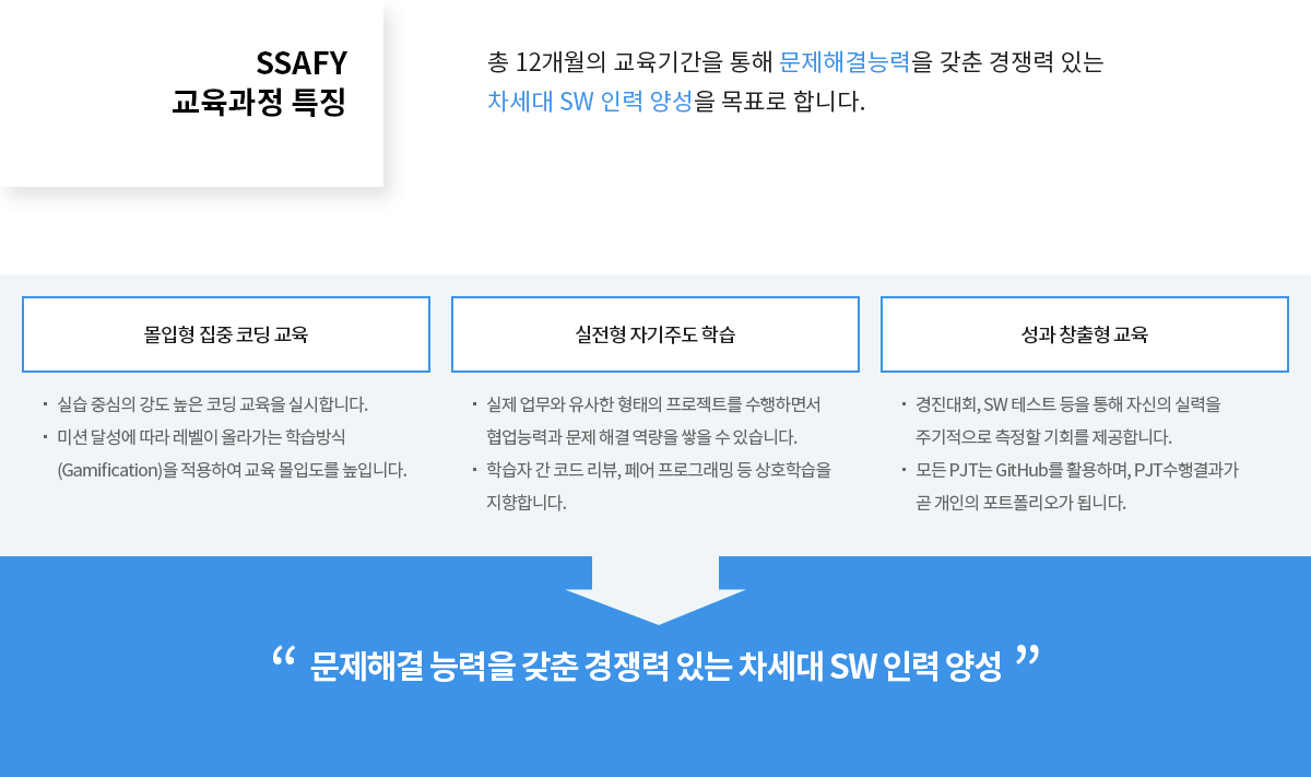 | - 프로젝트 수행을 통한 소프트웨어 개발자 육성 | - 맞춤형 경력 설계 - 취업 활동 · 채용 정보 중점 지원 |